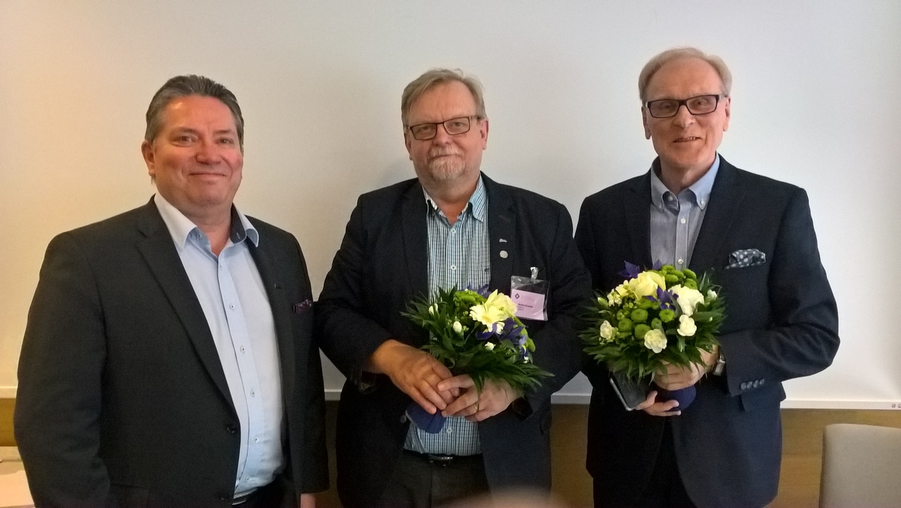 Vuosikokouksessa 2016 kunniapuheenjohtajaksi nimettiin koulutusneuvos Markku Suortamo. Kuvassa myös vasemmalla varapuheenjohtaja Peter Johnson sekä kunniapuheenjohtaja Tapio Holopainen oikealla.